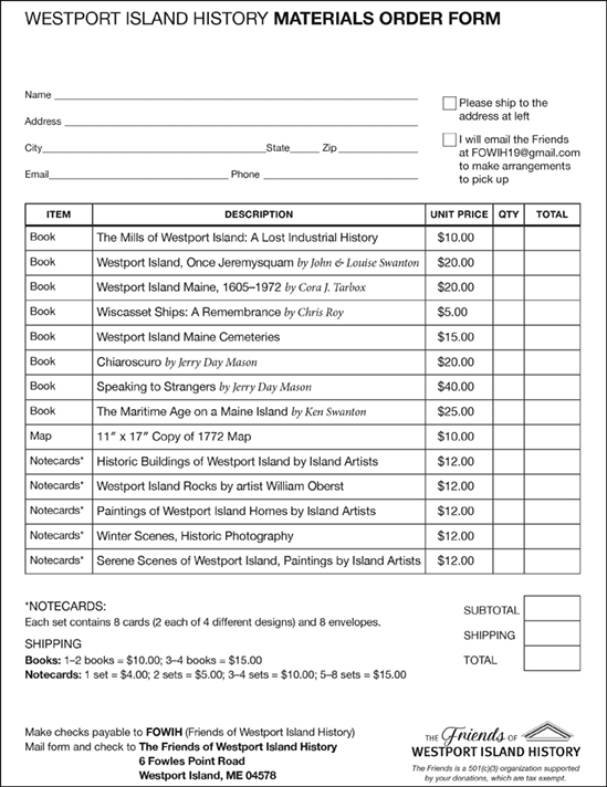 Available at the History Center and by mail, the items below make great gifts for you and your family. Fill out the order form, attach your payment, and mail it to 38 Ferry Road, Westport Island 04578. We will ship the items to you ASAP. Please be sure to include shipping charges.